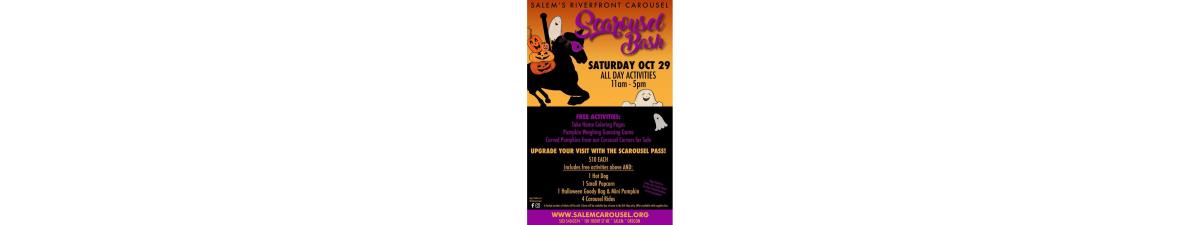 Upgrade your visit to the Carousel on Saturday Oct 29th but choosing the Scarousel Bash Pass! For only $10, receive 4 Carousel Rides, 1 hot dog, 1 small bag popcorn, 1 goody bag and a mini pumpkin!